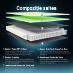 - Este o saltea de 24 cm inaltime, care combina tehnologia arcurilor impachetate individual cu spuma memory foam pentru un echilibru optim intre sustinere si confort.