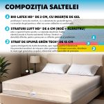 - Bio Latex HD® de 2 cm, cu insertie de gel, profilat pe 7 zone de confort, provine direct din natura, din arborele de cauciuc, este dus la o densitate uluitoare de peste 80 kg/m3, cu scopul de a-I conferi confort maxim si lungeste perioada de viata.