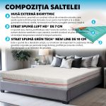 - Salteaua este dispusa in 3 straturi de spuma premium, Luft HD, Grun Tech si Memory Foam, cu densitati si fermitati diferite, rezistente pe termen lung, imbinate cu ajutorul unui adeziv ECO, toate pe baza de apa.
