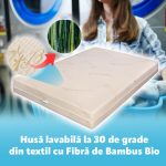 1. Husa Bio Bamboo, este foarte placuta la atingere, aspectuoasa, de culoare alb cu imprimeuri verzi, cu tesatura speciala pentru o foarte buna aerisire, este usor detasabila, prevazuta cu fermoar si este lavabila la 30 de grade.