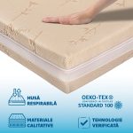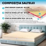 Am folosit spuma Memory HD pufoasa si foarte densa deasupra, am sustinut stratul de spuma cu memorie cu alt strat, Luft HD cea mai aerata spuma poliuretanica din Romania, cu scopul de a ventila suplimentar nucleul.