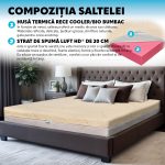 - Pe cealalta parte, salteaua de pat este prevazuta cu un material COOLER foarte inteligent, din fibre reci, cu rolul de a mentine o temperatura racoroasa la nivelul asternutului, in timpul verilor calduroase.
