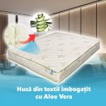- Husa Aloe Vera – este performanta, cusuta cu bordura pe margine si matlasata cu doua straturi de microfibra cu rolul de reglare a temperaturii din asternut.