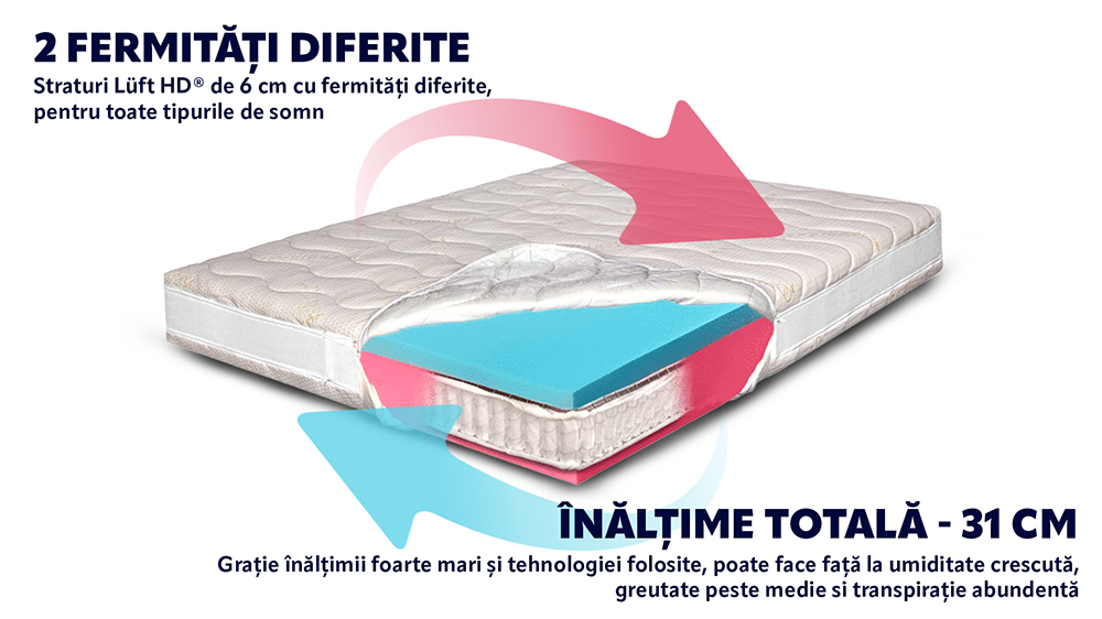 Luft HD®, de 6 cm (roz), este o spuma foarte aerata, (nu este memory) cu celulatie deschisa, foarte elastica, ferma si foarte rezistenta in timp. Ea aduce un surplus de ventilare a intregii saltele, corelat cu un plus de confort si de rezistenta in timp.