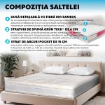 - Gratie inaltimii foarte mari, a stratului de 15 cm de arcuri impachetate, dar si a unei huse groase cu fibre ECO de Bambus de foarte buna calitate – este proiectata sa faca fata la umiditate crescuta, greutati mari si transpiratie abundenta.