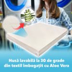 1. Husa saltelei – este certificata si tratata cu Aloe Vera, foarte placuta la atingere, cu un efect antitranspiratie, de un alb imaculat, astfel incat sa nu se vada prin lenjerie, aspectuoasa, cu tesatura rara pentru o foarte buna aerisire, este usor detasabila, prevazuta cu fermoar, fiind lavabila la 30 de grade.