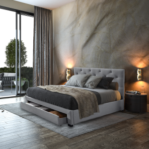 - Sertare multiple – modele precum Pat tapitat cu 2 sertare depozitare si somiera fixa, 200x200, Lars oferă două sertare robuste, ideale pentru depozitarea lenjeriilor sau a obiectelor personale, maximizând astfel spațiul fără a compromite estetica.